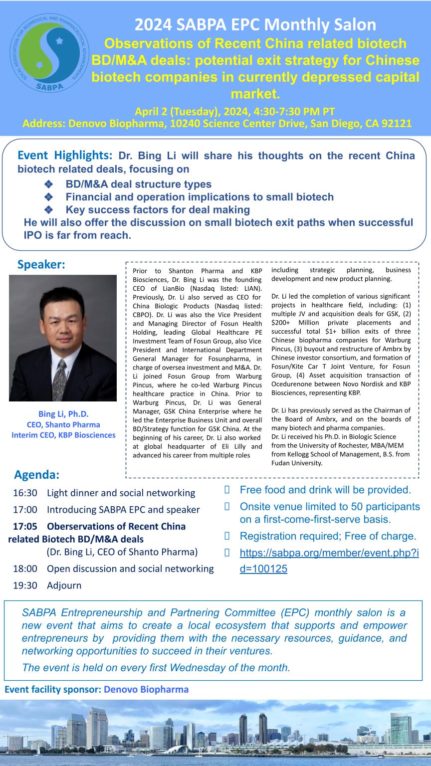 Dr. Bing Li will share his thoughts on the recent China biotech related deals, focusing on BD/M&A deal structure types, financial and operation implications to small biotech, key success factors for deal making. He will also offer the discussion on small biotech exit paths when successful IPO is far from reach.